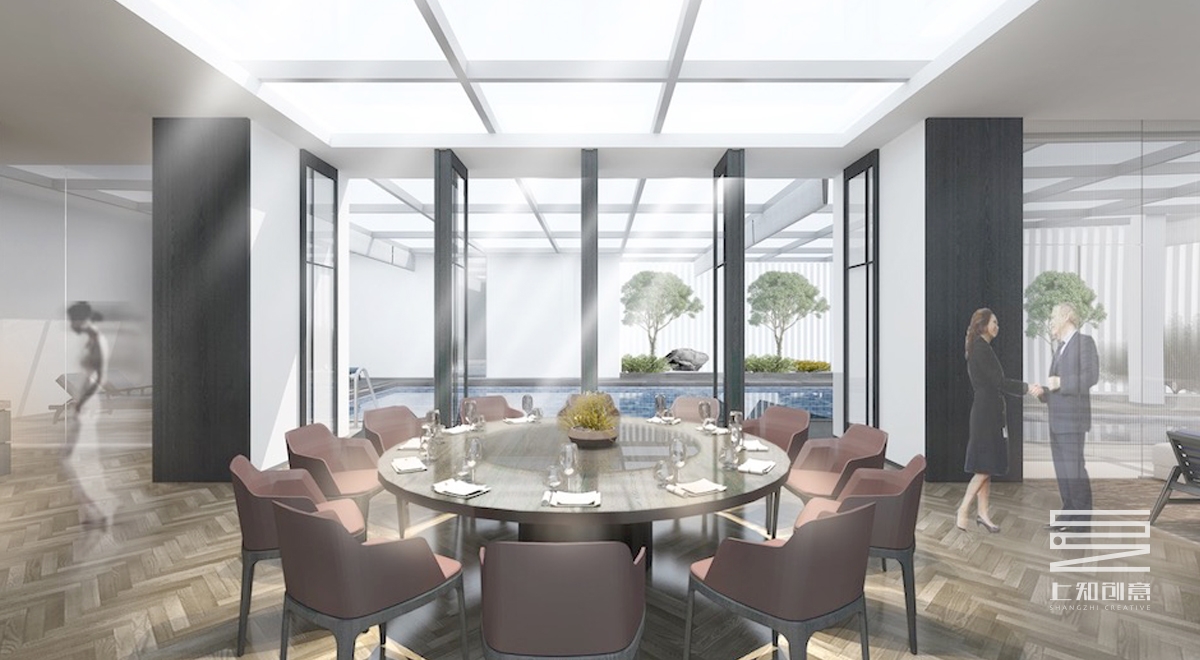 設(shè)計(jì)說(shuō)明:通過(guò)簡(jiǎn)潔的線條,以黑白灰為作為空間的主色調(diào),搭配紫色,橙色為跳躍色的現(xiàn)代設(shè)計(jì)手法,主要材料有灰色地毯,人字拼木地板,通透的玻璃隔斷,黑色木制隔柵。另頂層的游泳池,輔以古樸的瓦礫墻,搭配綠植,既生動(dòng)又美觀。